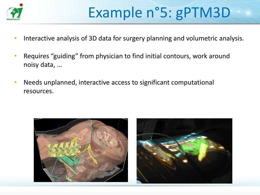 Example n°5: gPTM3D Interactive analysis of 3D data for surgery planning and volumetric analysis. Requires “guiding” from physician to find initial contours, work around noisy data, … Needs unplanned, interactive access to significant computational resources.
