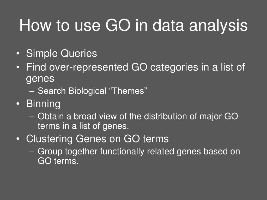How to use GO in data analysis • Simple Queries • Find over-represented GO categories in a list of genes • Search Biological “Themes” • Binning • Obtain a broad view of the distribution of major GO terms in a list of genes. • Clustering Genes on GO terms • Group together functionally related genes based on GO terms.