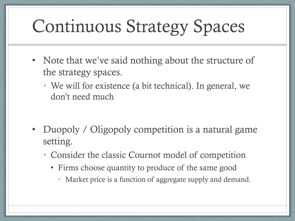 Continuous Strategy Spaces • Note that we’ve said nothing about the structure of the strategy spaces. • We will for existence (a bit technical). In general, we don’t need much • Duopoly / Oligopoly competition is a natural game setting. • Consider the classic Cournot model of competition • Firms choose quantity to produce of the same good • Market price is a function of aggregate supply and demand.
