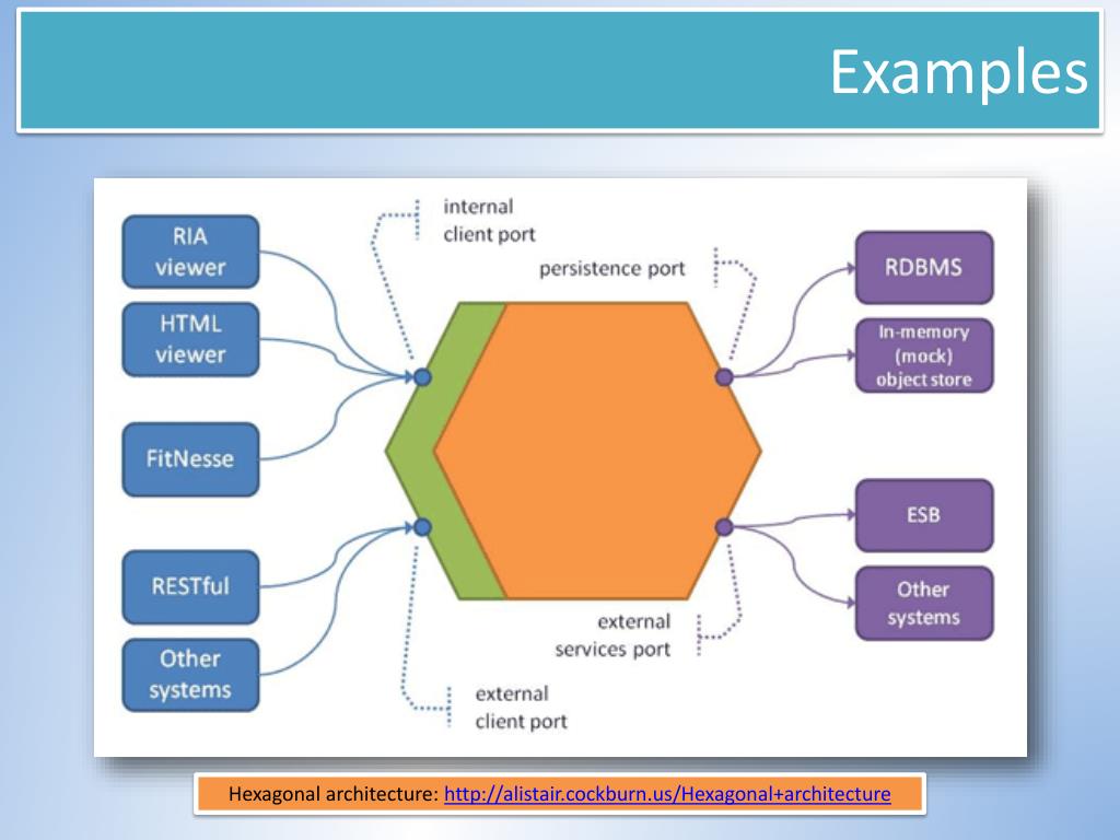 Examples Hexagonal architecture: http://alistair.cockburn.us/Hexagonal+architecture