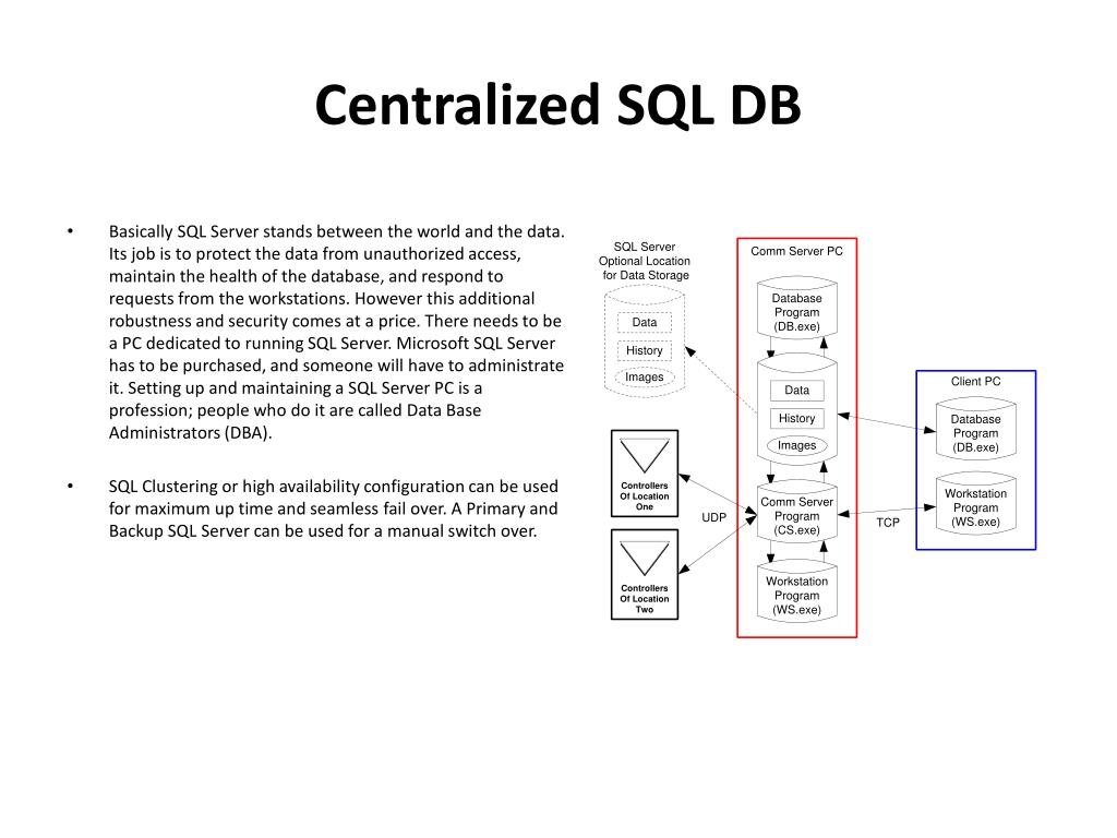 Centralized SQL DB • Basically SQL Server stands between the world and the data. Its job is to protect the data from unauthorized access, maintain the health of the database, and respond to requests from the workstations. However this additional robustness and security comes at a price. There needs to be a PC dedicated to running SQL Server. Microsoft SQL Server has to be purchased, and someone will have to administrate it. Setting up and maintaining a SQL Server PC is a profession; people who do it are called Data Base Administrators (DBA). • SQL Clustering or high availability configuration can be used for maximum up time and seamless fail over. A Primary and Backup SQL Server can be used for a manual switch over.