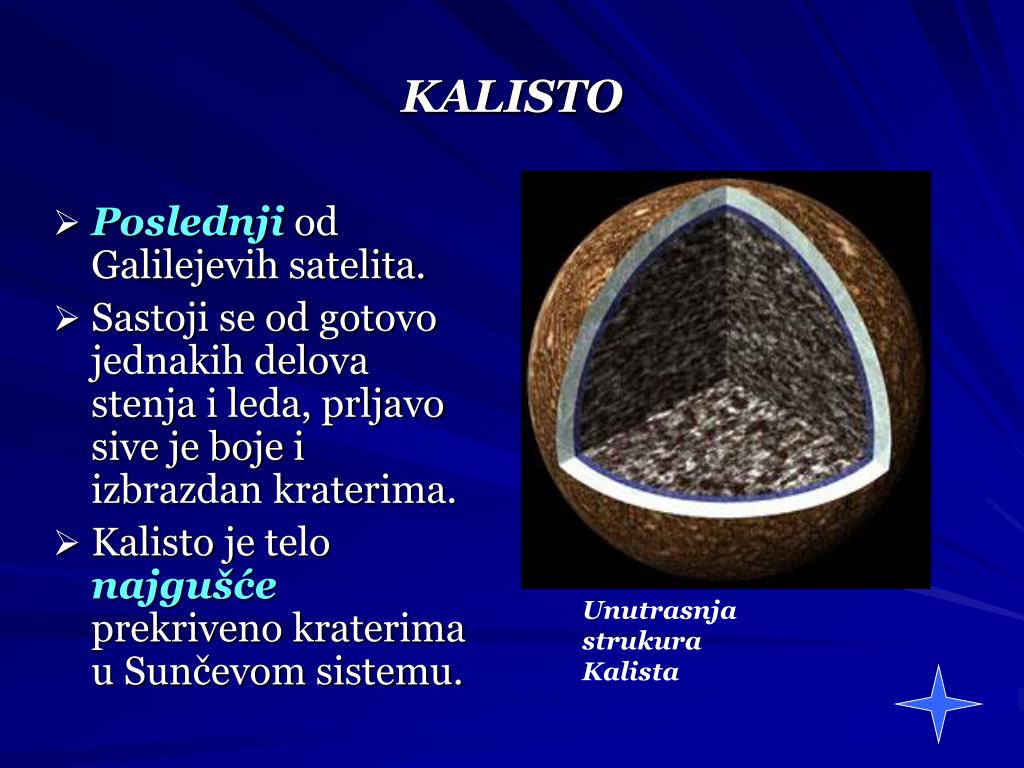 KALISTO • Poslednji od Galilejevih satelita. • Sastoji se od gotovo jednakih delova stenja i leda, prljavo sive je boje i izbrazdan kraterima. • Kalisto je telo najgušće prekriveno kraterima u Sunčevom sistemu. Unutrasnja strukura Kalista