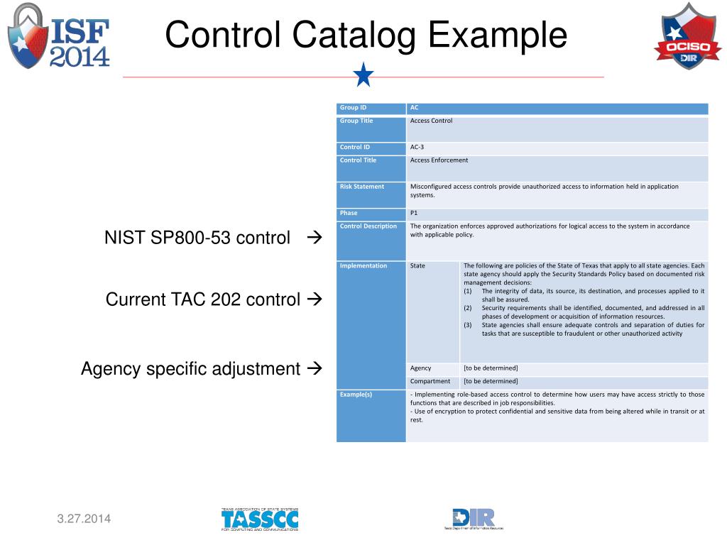 Control Catalog Example NIST SP800-53 control Current TAC 202 control Agency specific adjustment