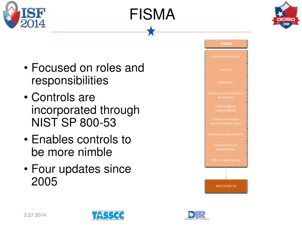 FISMA Information Security Purposes Definitions Authority and functions of the Director Federal agency responsibilities Federal information security incident center National security systems Authorization of appropriations Effect on existing law NIST SP 800 - 53 FISMA • Focused on roles and responsibilities • Controls are incorporated through NIST SP 800-53 • Enables controls to be more nimble • Four updates since 2005