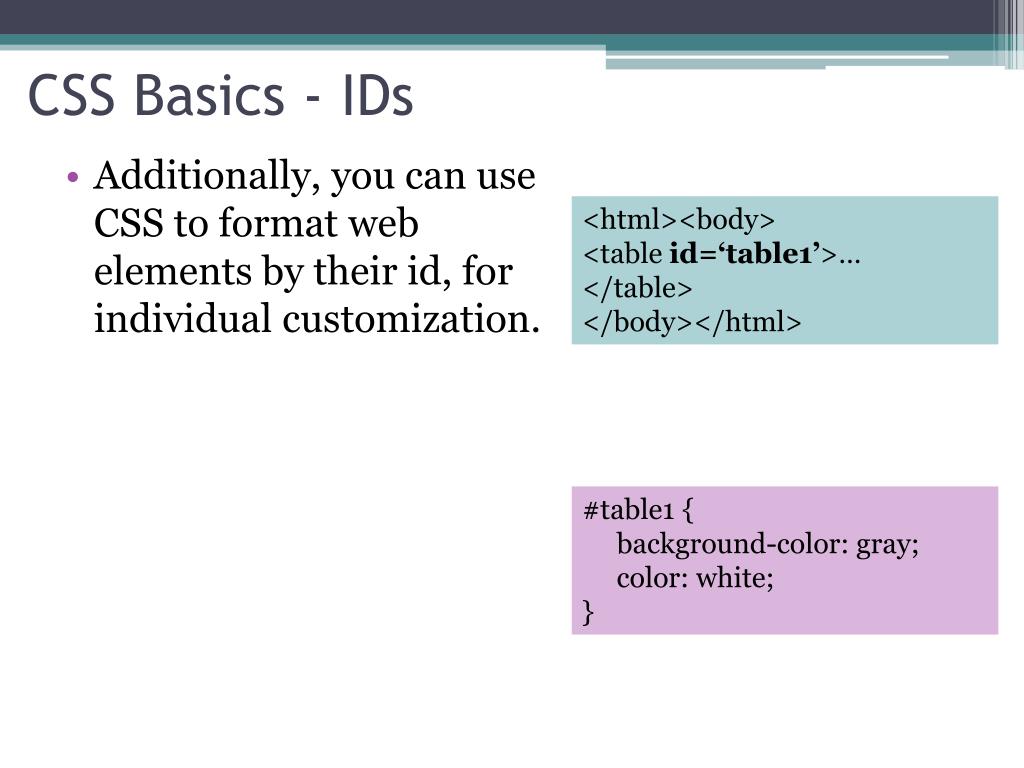 CSS Basics - IDs • Additionally, you can use CSS to format web elements by their id, for individual customization. <html><body> <table id=‘table1’>… </table> </body></html> #table1{ background-color: gray; color: white; }