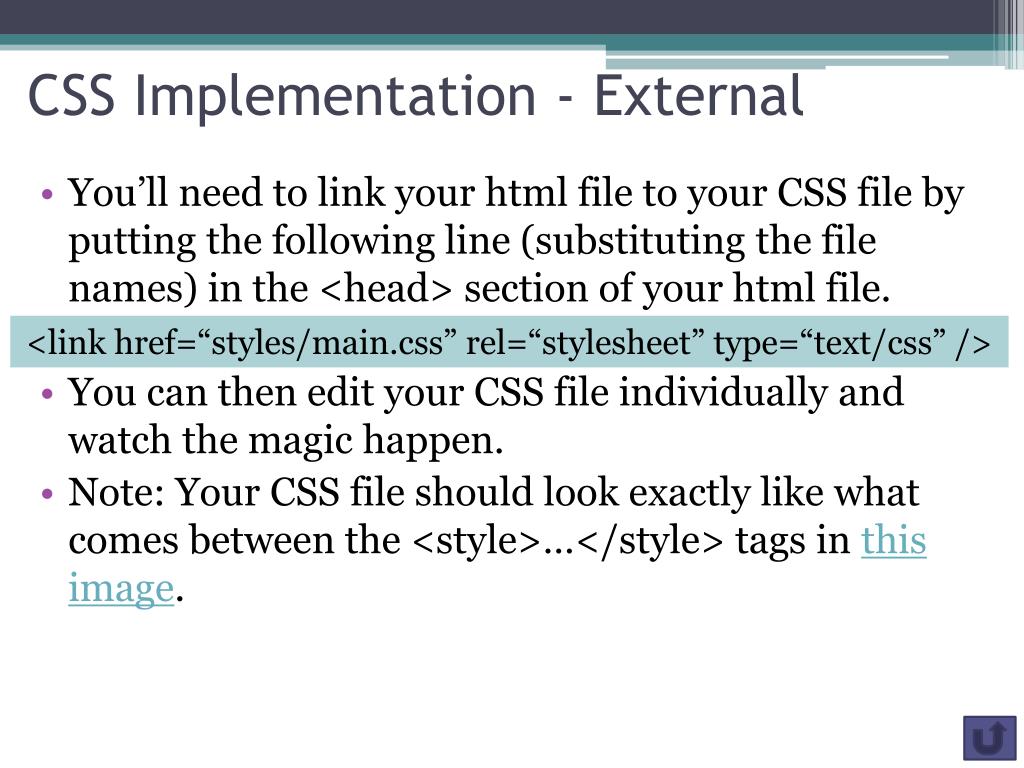 CSS Implementation - External • You’ll need to link your html file to your CSS file by putting the following line (substituting the file names) in the <head> section of your html file. • You can then edit your CSS file individually and watch the magic happen. • Note: Your CSS file should look exactly like what comes between the <style>…</style> tags in this image. <link href=“styles/main.css” rel=“stylesheet” type=“text/css” />