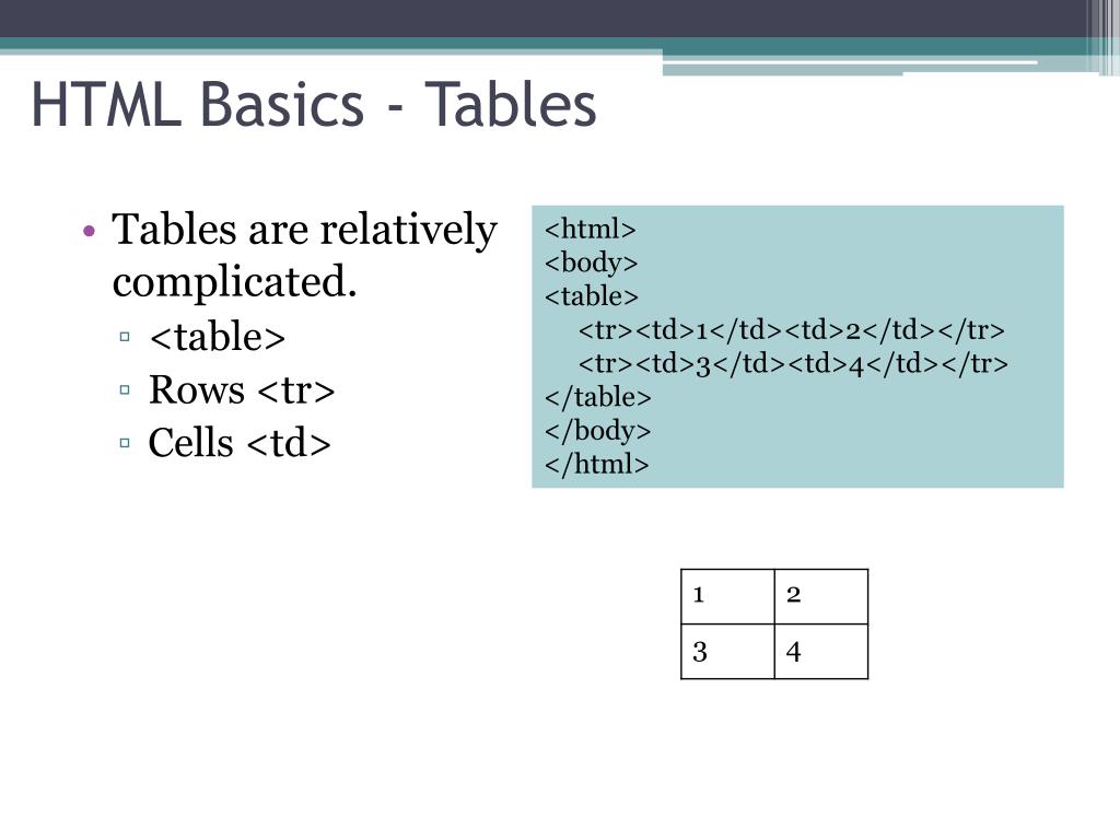 HTML Basics - Tables • Tables are relatively complicated. • <table> • Rows <tr> • Cells <td> <html> <body> <table> <tr><td>1</td><td>2</td></tr> <tr><td>3</td><td>4</td></tr> </table> </body> </html>