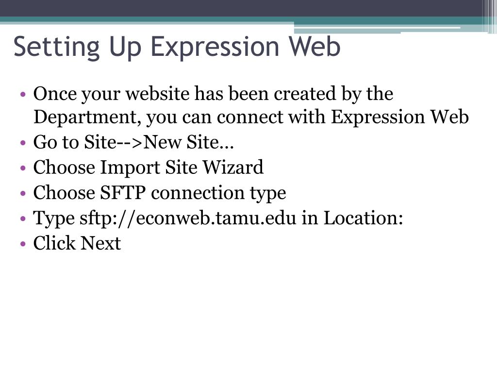 Setting Up Expression Web • Once your website has been created by the Department, you can connect with Expression Web • Go to Site-->New Site… • Choose Import Site Wizard • Choose SFTP connection type • Type sftp://econweb.tamu.edu in Location: • Click Next