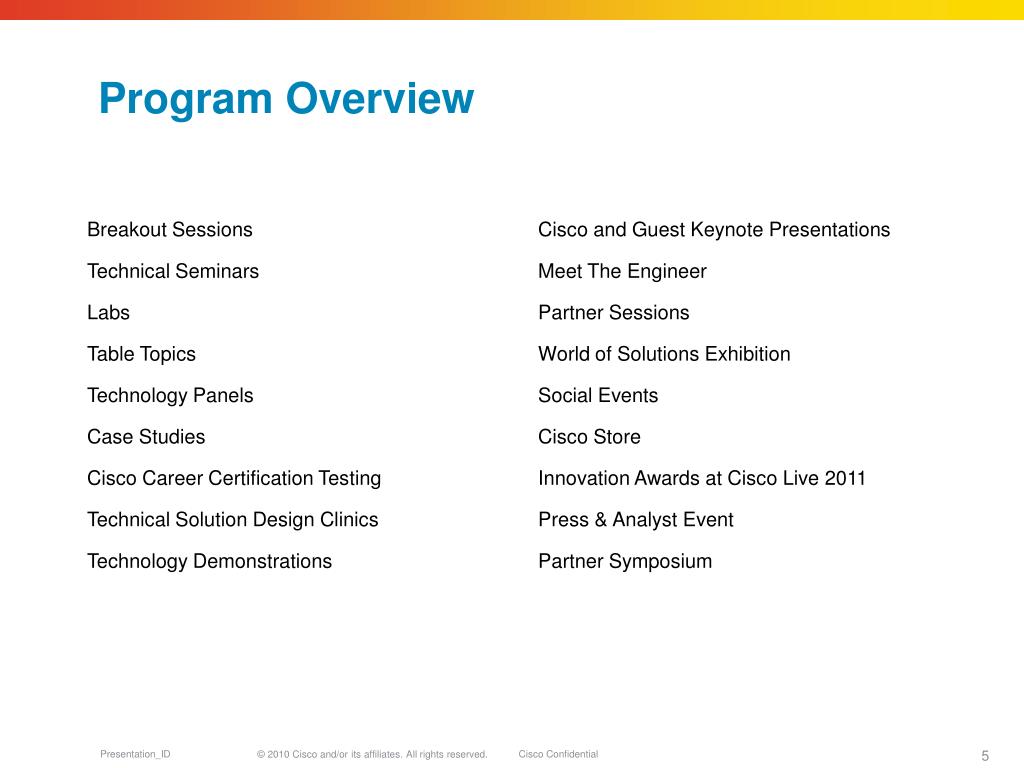 Program Overview Breakout Sessions Technical Seminars Labs Table Topics Technology Panels Case Studies Cisco Career Certification Testing Technical Solution Design Clinics Technology Demonstrations • Cisco and Guest Keynote Presentations • Meet The Engineer • Partner Sessions • World of Solutions Exhibition • Social Events • Cisco Store • Innovation Awards at Cisco Live 2011 • Press & Analyst Event • Partner Symposium