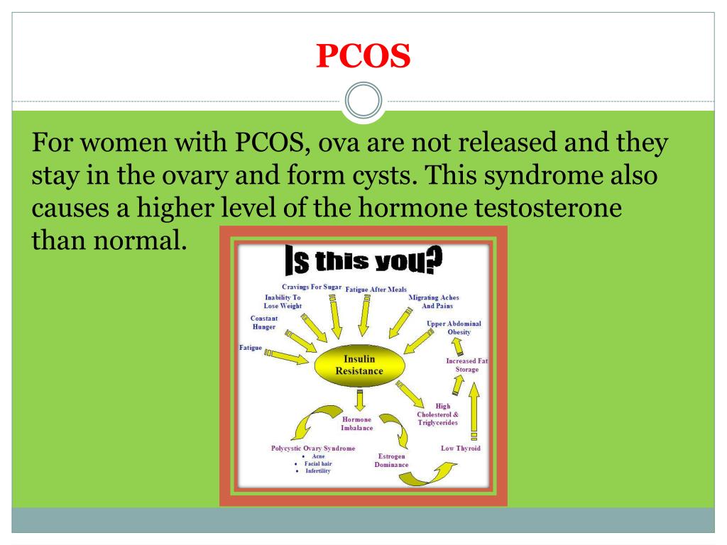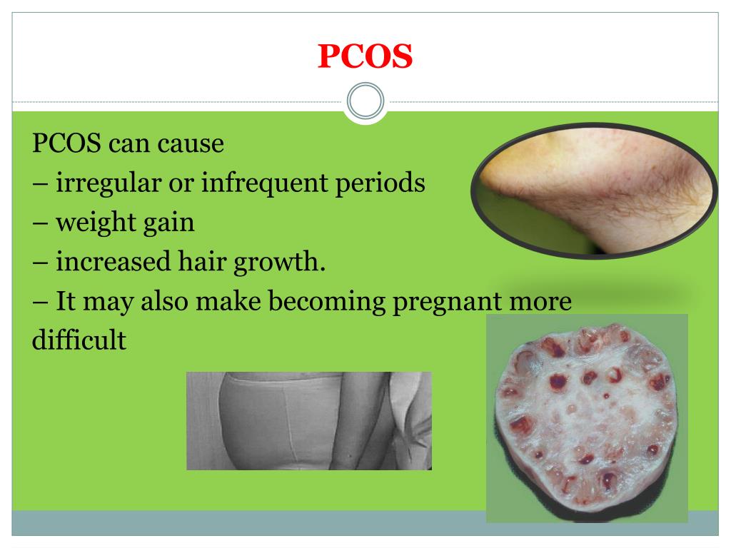 PCOS PCOS can cause – irregular or infrequent periods – weight gain – increased hair growth. – It may also make becoming pregnant more difficult
