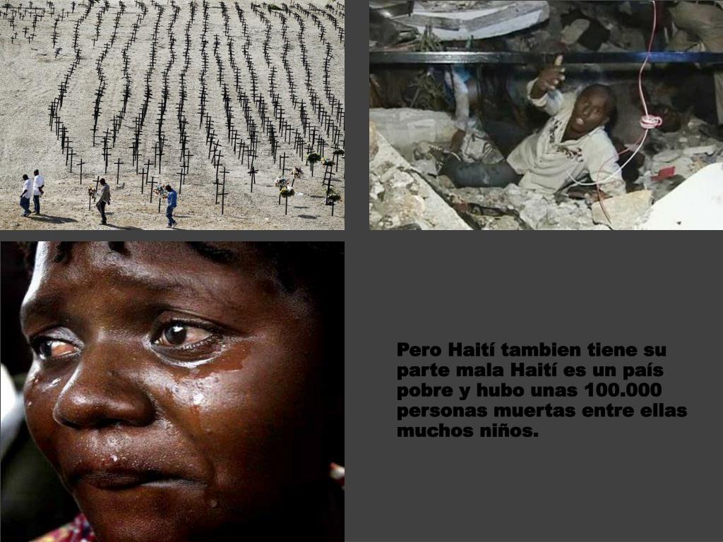 Pero Haití tambien tiene su parte mala Haití es un país pobre y hubo unas 100.000 personas muertas entre ellas muchos niños.