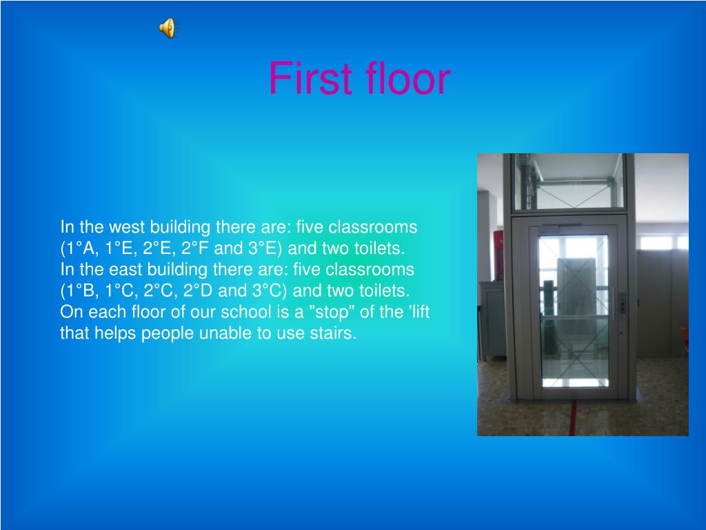 First floor In the west building there are: five classrooms (1°A, 1°E, 2°E, 2°F and 3°E) and two toilets. In the east building there are: five classrooms (1°B, 1°C, 2°C, 2°D and 3°C) and two toilets. On each floor of our school is a "stop" of the 'lift that helps people unable to use stairs.