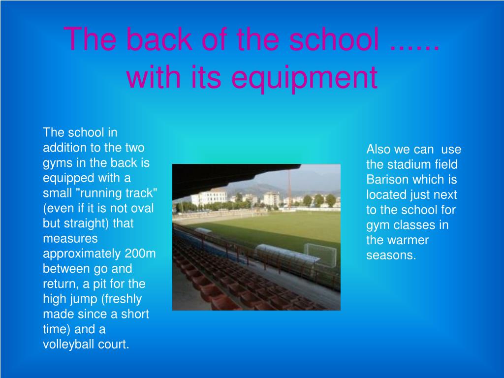 The back of the school ...... with its equipment The school in addition to the two gyms in the back is equipped with a small "running track" (even if it is not oval but straight) that measures approximately 200m between go and return, a pit for the high jump (freshly made since a short time) and a volleyball court. Also we can use the stadium field Barison which is located just next to the school for gym classes in the warmer seasons.