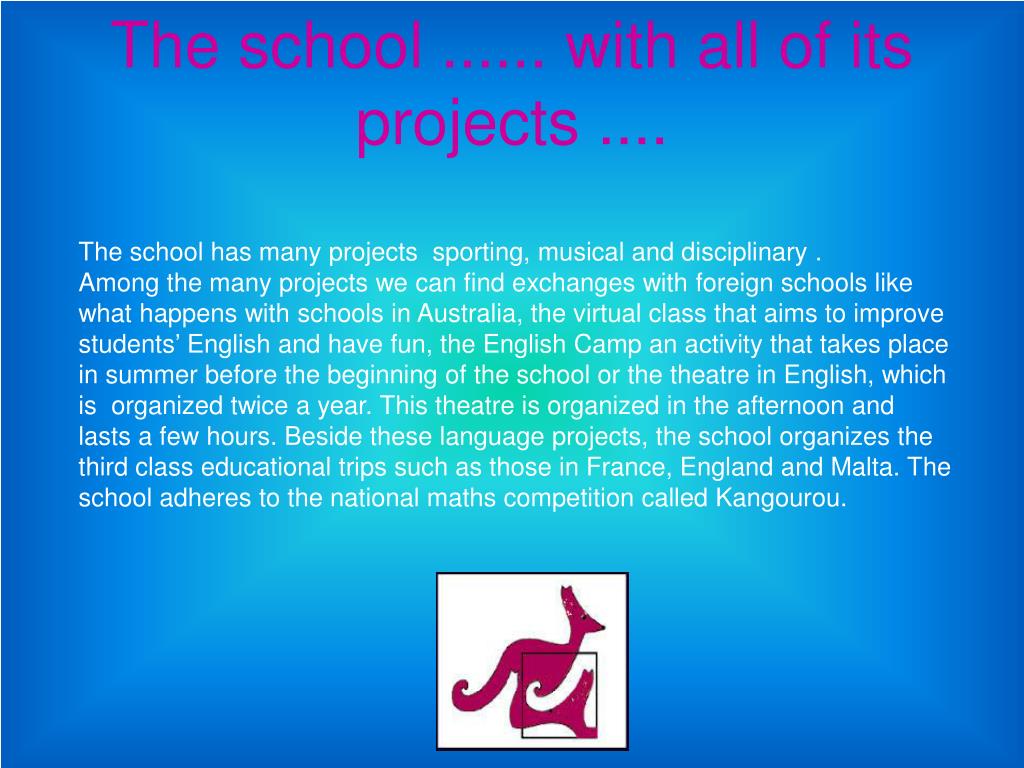 The school ...... with all of its projects .... The school has many projects sporting, musical and disciplinary . Among the many projects we can find exchanges with foreign schools like what happens with schools in Australia, the virtual class that aims to improve students’ English and have fun, the English Camp an activity that takes place in summer before the beginning of the school or the theatre in English, which is organized twice a year. This theatre is organized in the afternoon and lasts a few hours. Beside these language projects, the school organizes the third class educational trips such as those in France, England and Malta. The school adheres to the national maths competition called Kangourou.