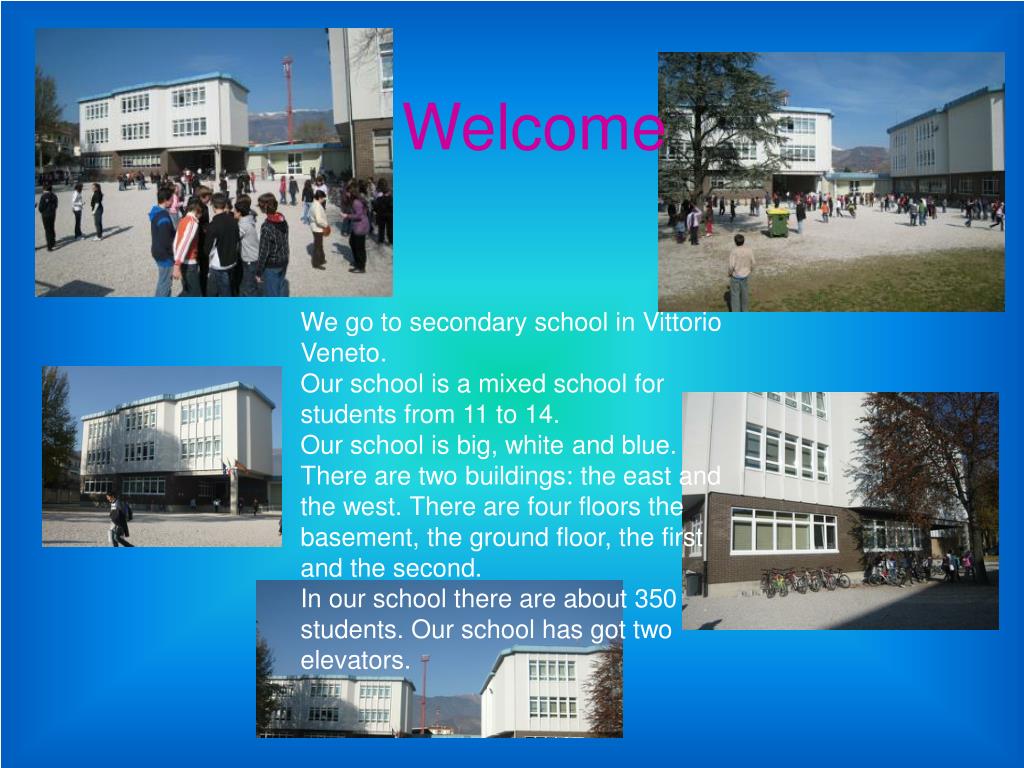 Welcome We go to secondary school in Vittorio Veneto. Our school is a mixed school for students from 11 to 14. Our school is big, white and blue. There are two buildings: the east and the west. There are four floors the basement, the ground floor, the first and the second. In our school there are about 350 students. Our school has got two elevators.