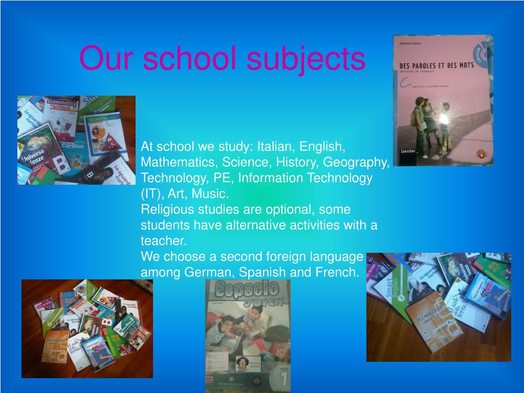 Our school subjects At school we study: Italian, English, Mathematics, Science, History, Geography, Technology, PE, Information Technology (IT), Art, Music. Religious studies are optional, some students have alternative activities with a teacher. We choose a second foreign language among German, Spanish and French.