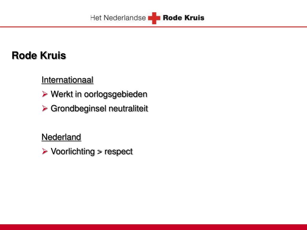 Rode Kruis Internationaal • Werkt in oorlogsgebieden • Grondbeginsel neutraliteit Nederland • Voorlichting > respect