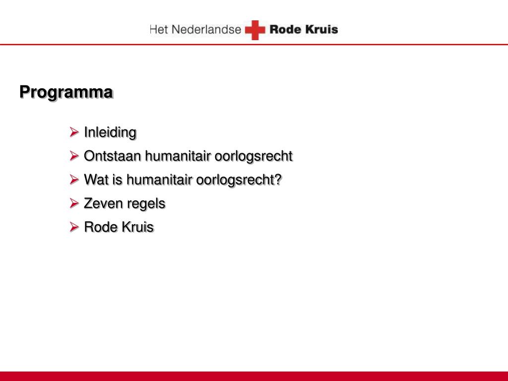 Programma • Inleiding • Ontstaan humanitair oorlogsrecht • Wat is humanitair oorlogsrecht? • Zeven regels • Rode Kruis