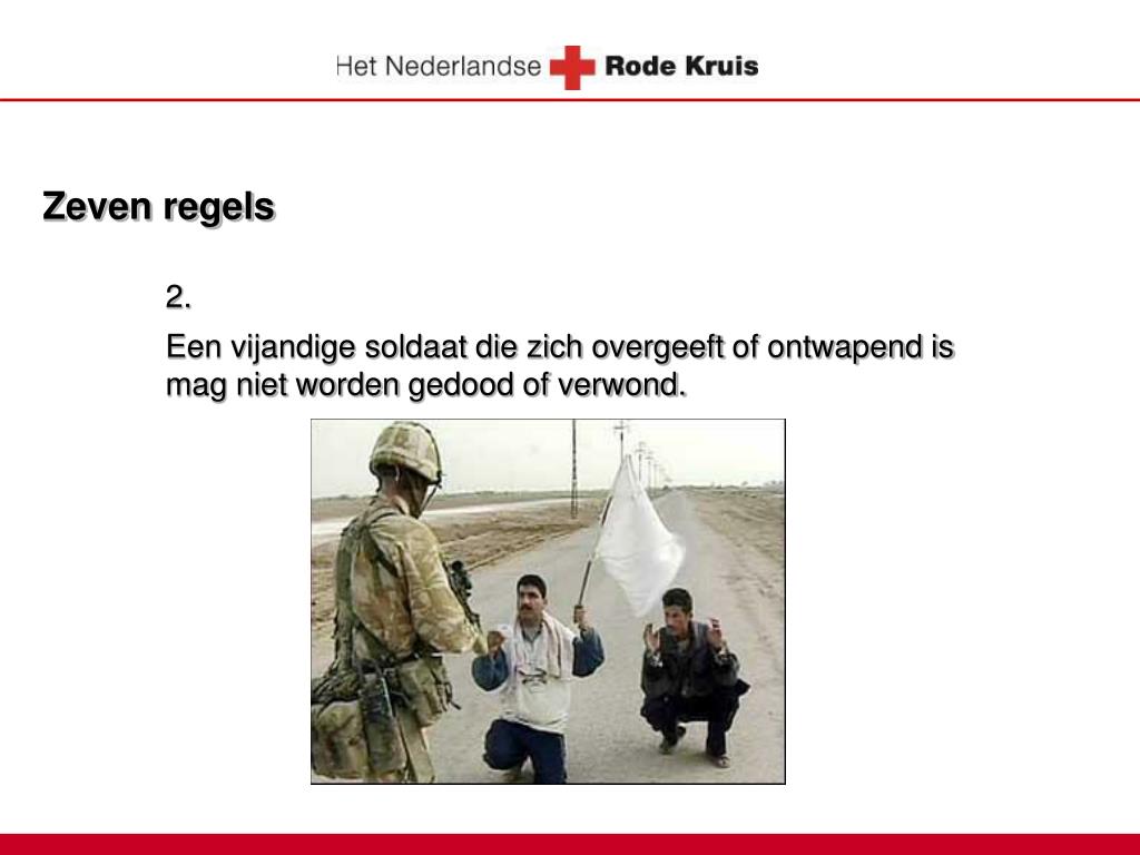 Zeven regels 2. • Een vijandige soldaat die zich overgeeftof ontwapend is mag niet wordengedood of verwond.
