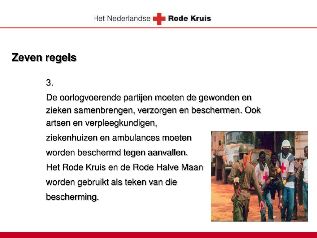 Zeven regels 3. De oorlogvoerende partijen moeten degewonden en zieken samenbrengen, verzorgen en beschermen. Ook artsen en verpleegkundigen, ziekenhuizen en ambulances moeten worden beschermd tegen aanvallen. Het Rode Kruis en de Rode Halve Maan worden gebruikt als teken van die bescherming.