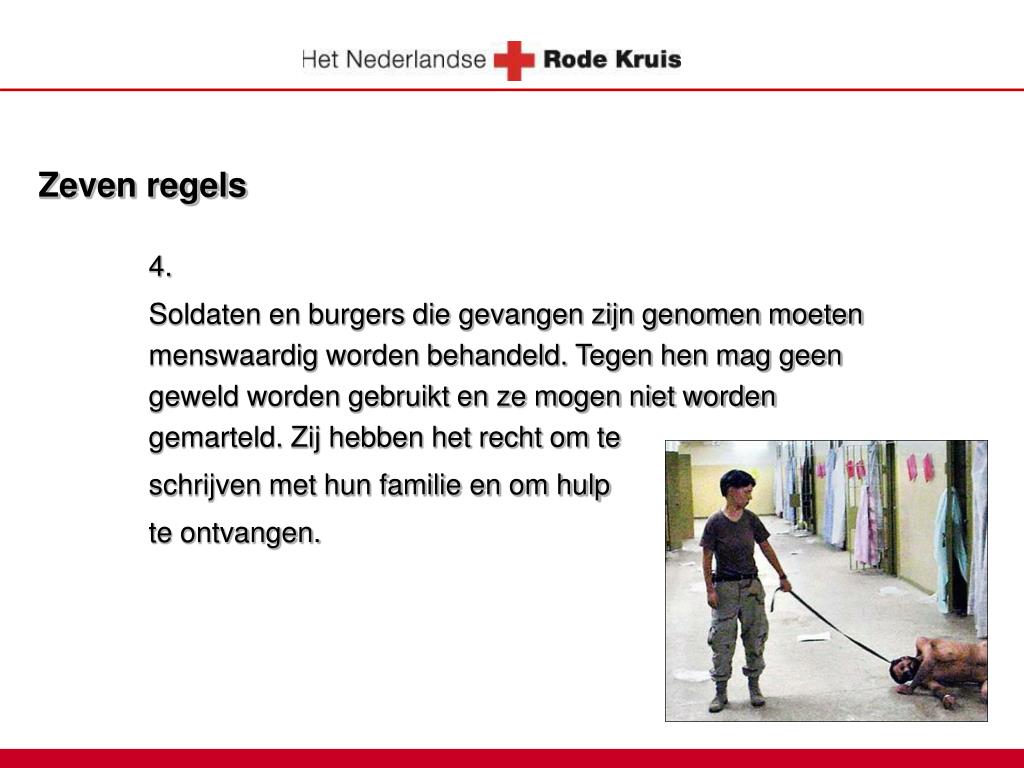 Zeven regels 4. Soldaten en burgers die gevangen zijn genomen moeten menswaardig worden behandeld. Tegen hen mag geen geweld worden gebruikt en ze mogen niet worden gemarteld. Zij hebben het recht om te schrijven met hun familie en om hulp te ontvangen.