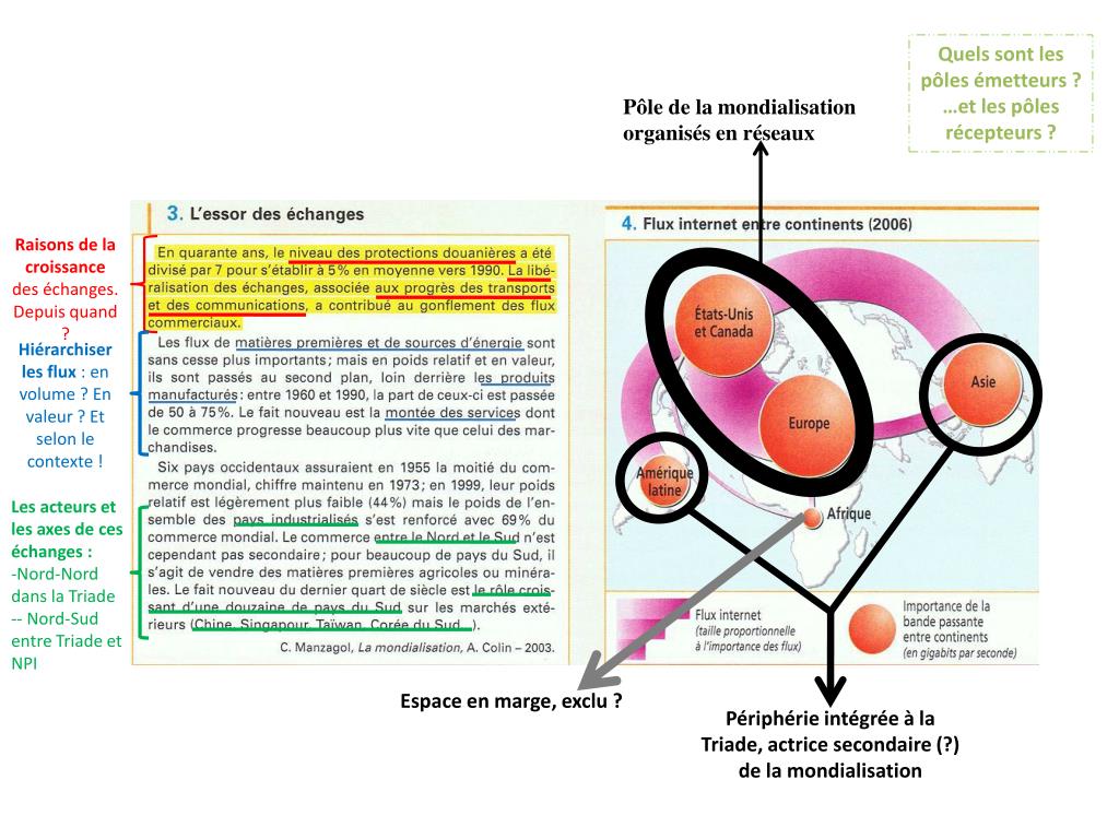 Quels sont les pôles émetteurs ? …et les pôles récepteurs ? Pôle de la mondialisation organisés en réseaux Raisons de la croissance des échanges. Depuis quand ? Hiérarchiser les flux : en volume ? En valeur ? Et selon le contexte ! • Les acteurs et les axes de ces échanges : • Nord-Nord dans la Triade • - Nord-Sud entre Triade et NPI Espace en marge, exclu ? Périphérie intégrée à la Triade, actrice secondaire (?) de la mondialisation