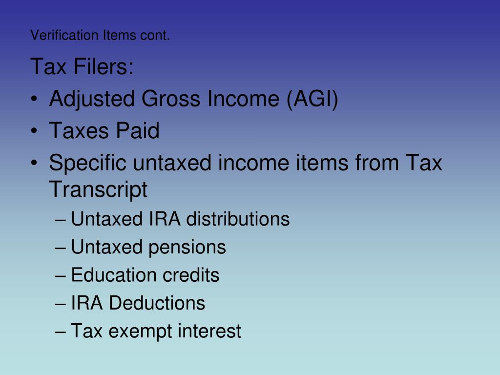 Verification Items cont. Tax Filers: • Adjusted Gross Income (AGI) • Taxes Paid • Specific untaxed income items from Tax Transcript • Untaxed IRA distributions • Untaxed pensions • Education credits • IRA Deductions • Tax exempt interest