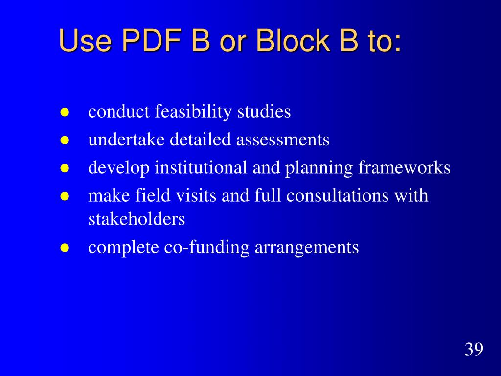 Use PDF B or Block B to: • conduct feasibility studies • undertake detailed assessments • develop institutional and planning frameworks • make field visits and full consultations with stakeholders • complete co-funding arrangements
