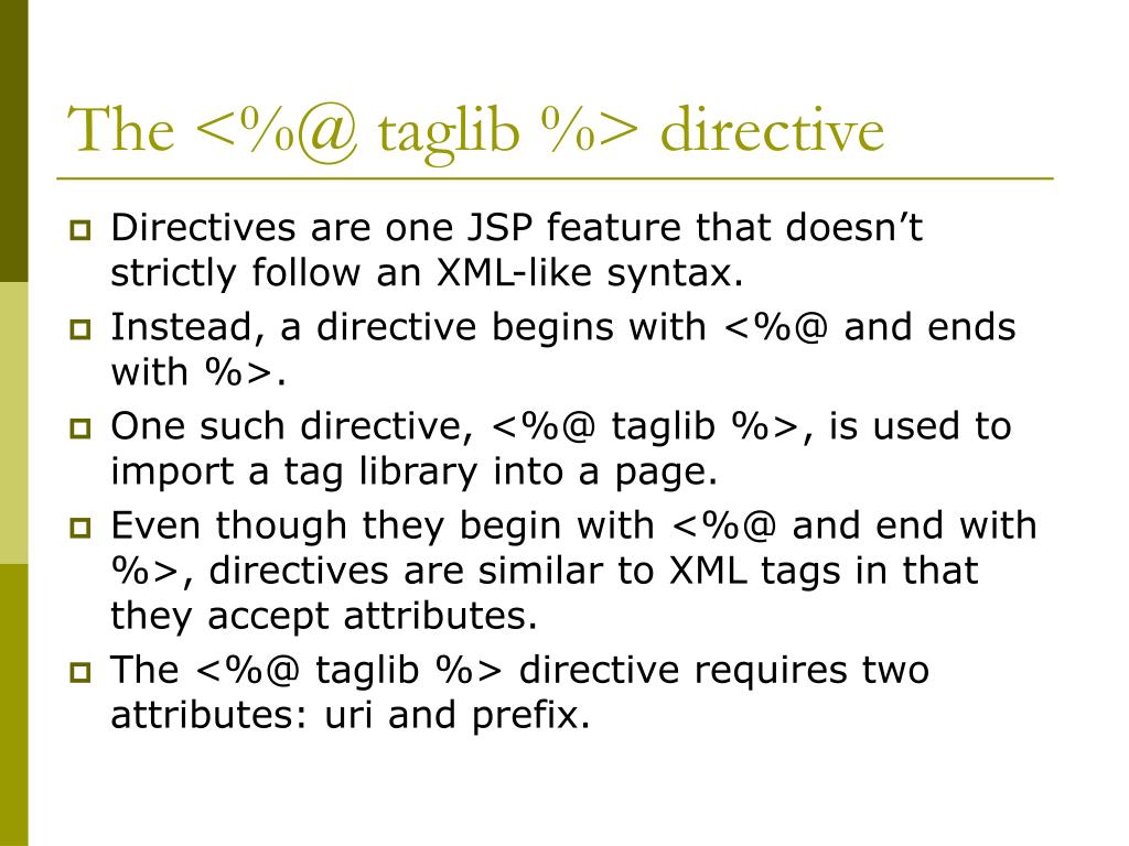 The <%@ taglib %> directive • Directives are one JSP feature that doesn’t strictly follow an XML-like syntax. • Instead, a directive begins with <%@ and ends with %>. • One such directive, <%@ taglib %>, is used to import a tag library into a page. • Even though they begin with <%@ and end with %>, directives are similar to XML tags in that they accept attributes. • The <%@ taglib %> directive requires two attributes: uri and prefix.
