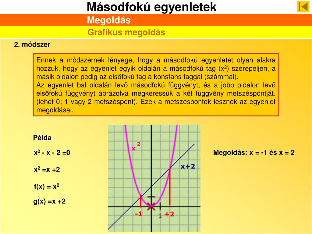 Megoldás Grafikus megoldás 2. módszer Ennek a módszernek lényege, hogy a másodfokú egyenletet olyan alakra hozzuk, hogy az egyenlet egyik oldalán a másodfokú tag (x2) szerepeljen, a másik oldalon pedig az elsőfokú tag a konstans taggal (számmal). Az egyenlet bal oldalán levő másodfokú függvényt, és a jobb oldalon levő elsőfokú függvényt ábrázolva megkeressük a két függvény metszéspontját. (lehet 0; 1 vagy 2 metszéspont). Ezek a metszéspontok lesznek az egyenlet megoldásai. Példa Megoldás: x = -1 és x = 2 x2 - x - 2 =0 x2 =x +2 f(x) = x2 g(x) =x +2