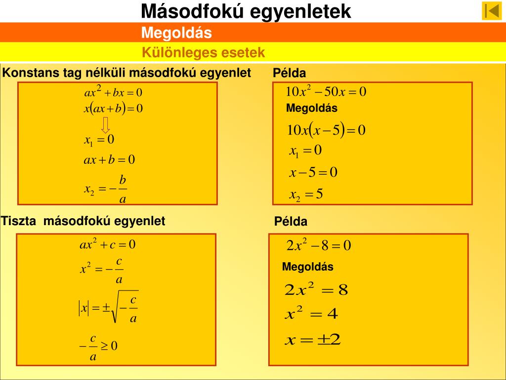 Példa Tiszta másodfokú egyenlet Példa Megoldás Különleges esetek Konstans tag nélküli másodfokú egyenlet Megoldás Megoldás