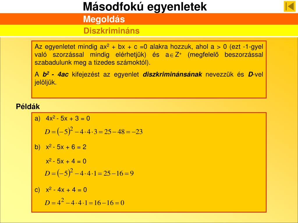 Az egyenletet mindig ax2 + bx + c =0 alakra hozzuk, ahol a > 0 (ezt -1-gyel való szorzással mindig elérhetjük) és a Z+ (megfelelő beszorzással szabadulunk meg a tizedes számoktól). A b2 - 4ac kifejezést az egyenlet diszkriminánsának nevezzük és D-vel jelöljük. Megoldás Diszkrimináns Példák • 4x2 - 5x + 3 = 0 • x2 - 5x + 6 = 2 • x2 - 5x + 4 = 0 • x2 - 4x + 4 = 0