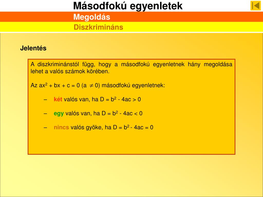 A diszkriminánstól függ, hogy a másodfokú egyenletnek hány megoldása lehet a valós számok körében. • Az ax2 + bx + c = 0 (a 0) másodfokú egyenletnek: • két valós van, ha D = b2 - 4ac > 0 • egy valós van, ha D = b2 - 4ac < 0 • nincs valós gyöke, ha D = b2 - 4ac = 0 Megoldás Diszkrimináns Jelentés