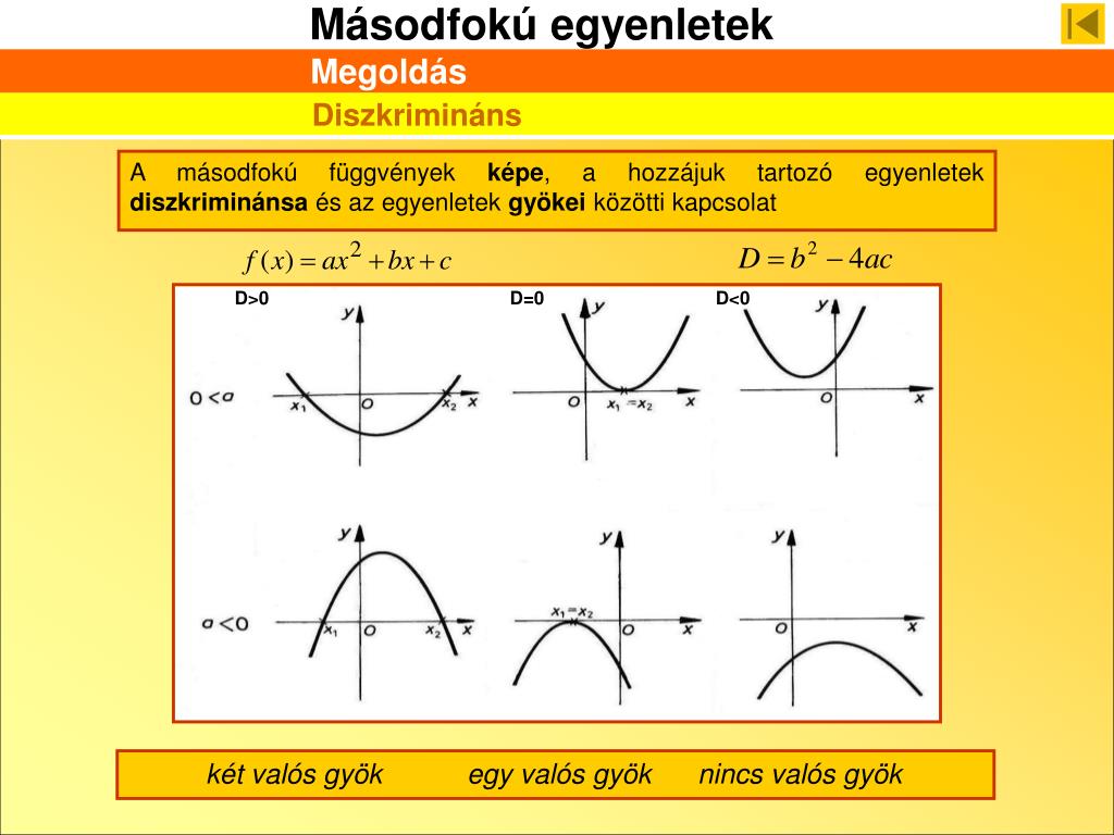 D>0 D=0 D<0 Megoldás Diszkrimináns A másodfokú függvények képe, a hozzájuk tartozó egyenletek diszkriminánsa és az egyenletek gyökei közötti kapcsolat két valós gyök egy valós gyök nincs valós gyök