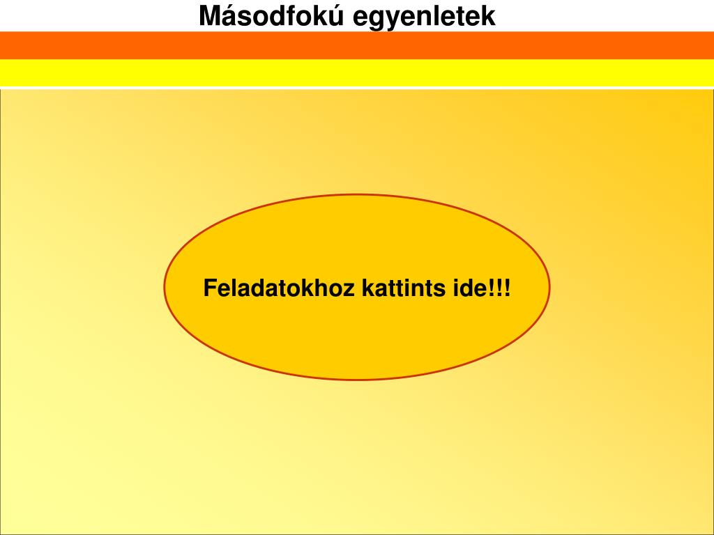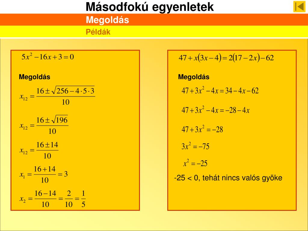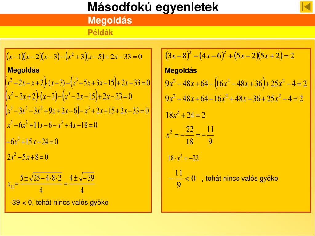 Megoldás Példák Megoldás Megoldás -45 < 0, tehát nincs valós gyöke
