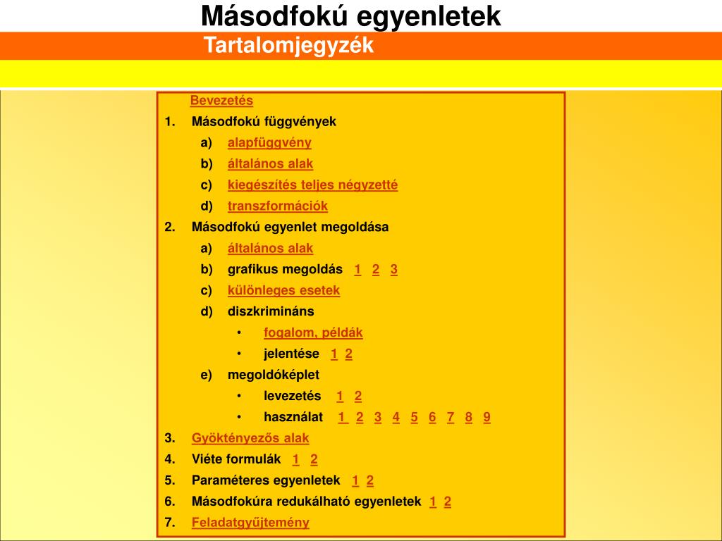 Tartalomjegyzék • Bevezetés • Másodfokú függvények • alapfüggvény • általános alak • kiegészítés teljes négyzetté • transzformációk • Másodfokú egyenlet megoldása • általános alak • grafikus megoldás 123 • különleges esetek • diszkrimináns • fogalom, példák • jelentése 12 • megoldóképlet • levezetés 12 • használat 1 23456789 • Gyöktényezős alak • Viéte formulák 12 • Paraméteres egyenletek 12 • Másodfokúra redukálható egyenletek 12 • Feladatgyűjtemény