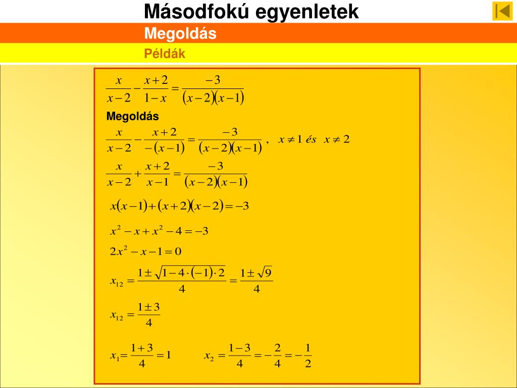 Megoldás Viéte formulákból következik: A feladatból következik: Akkor: Paraméteres egyenletek Példák 1. példa Állapítsa meg a c értékét az x2 - 4x + c =0 egyenletben úgy, hogy a másodfokú egyenlet egyik gyöke a másik négyszerese legyen.