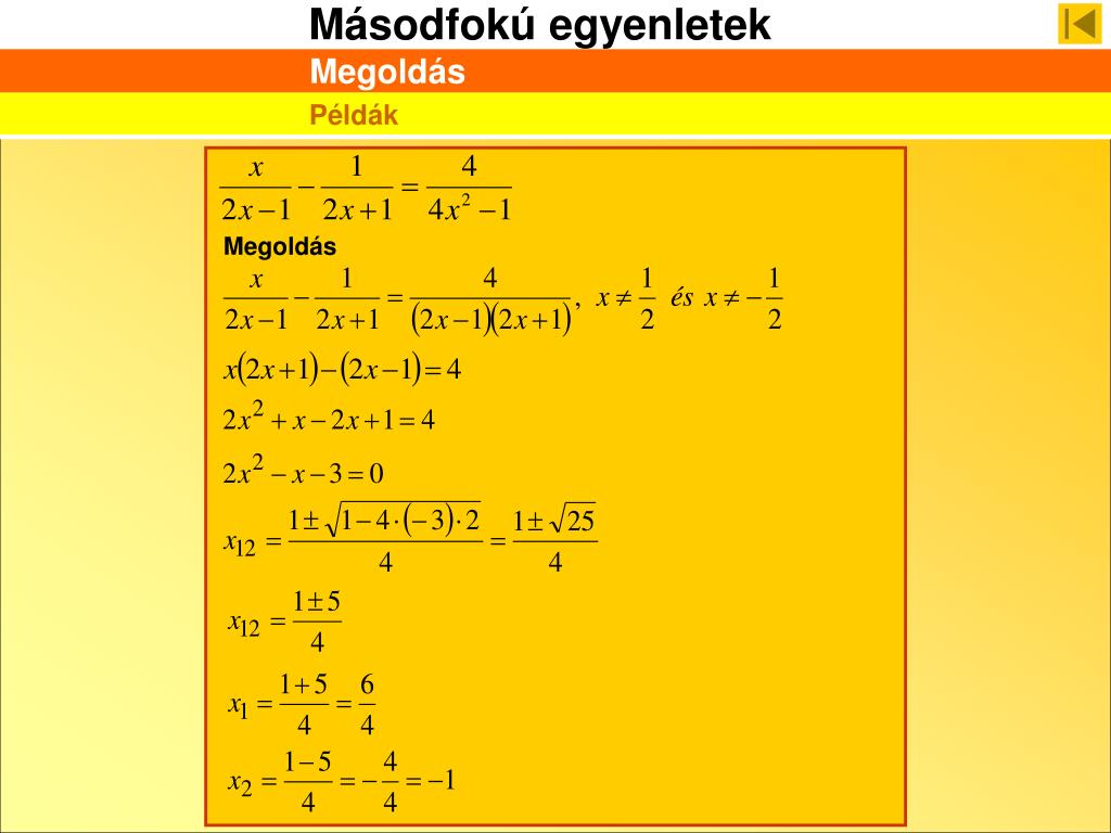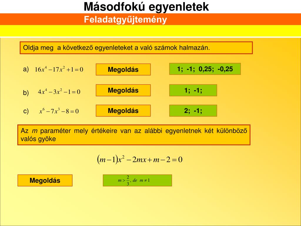 Feladatgyűjtemény Oldja meg a következő egyenleteket a való számok halmazán. a) 1; -1; 0,25; -0,25 Megoldás Megoldás 1; -1; b) Megoldás 2; -1; c) Az m paraméter mely értékeire van az alábbi egyenletnek két különböző valós gyöke Megoldás