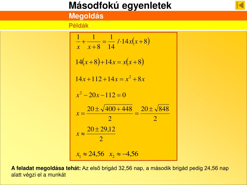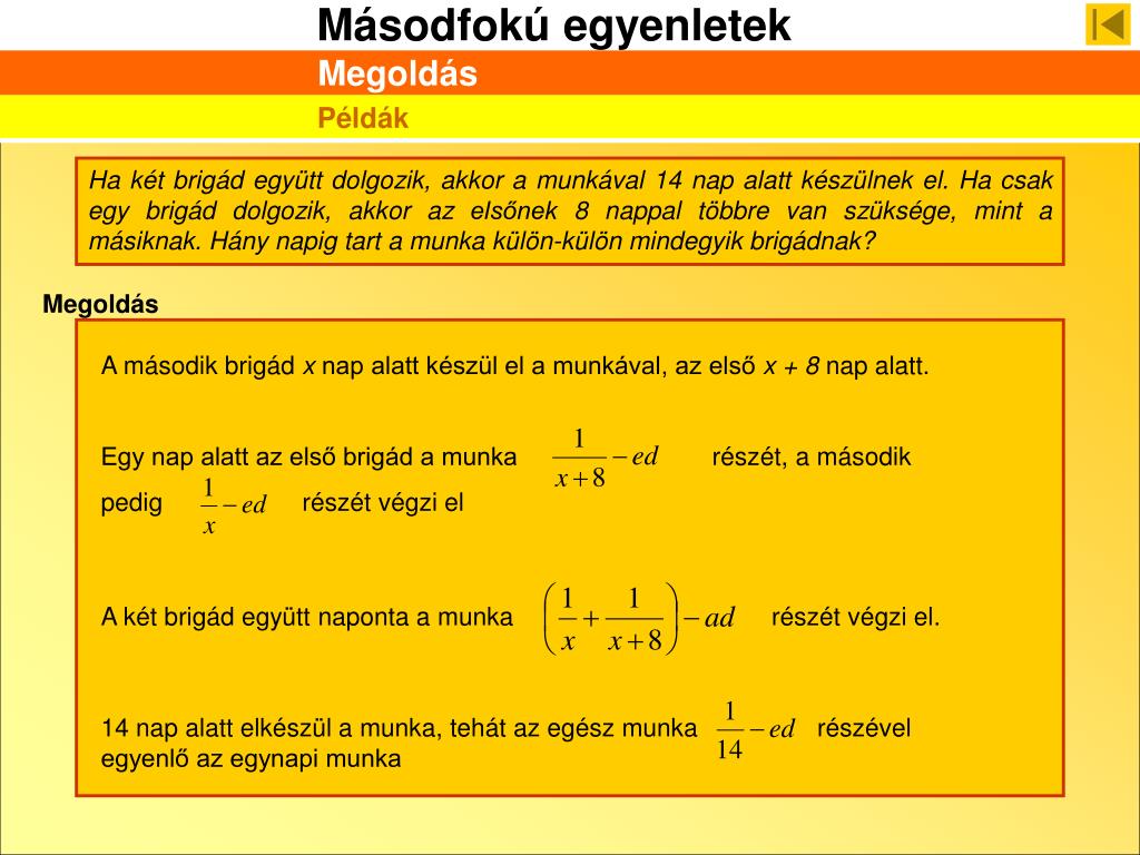 A második brigád x nap alatt készül el a munkával, az első x + 8 nap alatt. Egy nap alatt az első brigád a munka részét, a második pedig részét végzi el A két brigád együtt naponta a munka részét végzi el. 14 nap alatt elkészül a munka, tehát az egész munka részével egyenlő az egynapi munka Megoldás Példák Ha két brigád együtt dolgozik, akkor a munkával 14 nap alatt készülnek el. Ha csak egy brigád dolgozik, akkor az elsőnek 8 nappal többre van szüksége, mint a másiknak. Hány napig tart a munka külön-külön mindegyik brigádnak? Megoldás