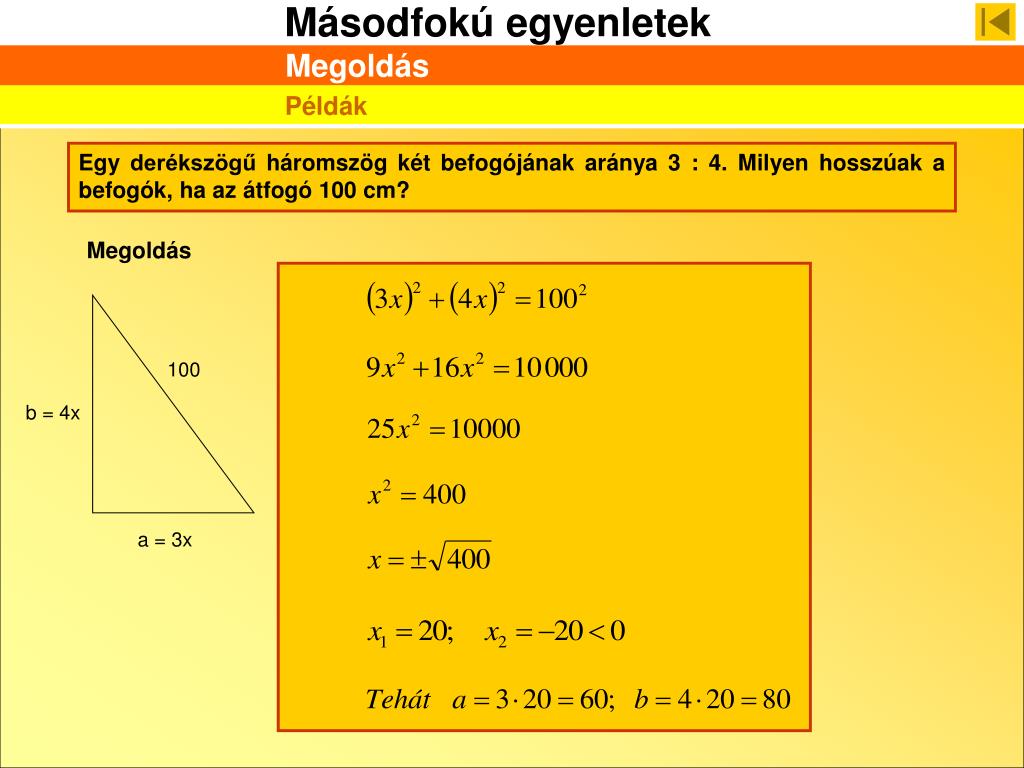 100 b = 4x a = 3x Megoldás Példák Egy derékszögű háromszög két befogójának aránya 3 : 4. Milyen hosszúak a befogók, ha az átfogó 100 cm? Megoldás