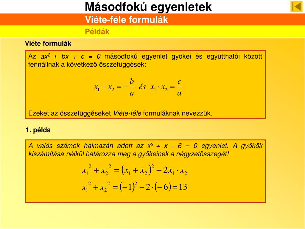 Az ax2 + bx + c = 0 másodfokú egyenlet gyökei és együtthatói között fennállnak a következő összefüggések: Ezeket az összefüggéseket Viéte-féle formuláknak nevezzük. 1. példa A valós számok halmazán adott az x2 + x - 6 = 0 egyenlet. A gyökök kiszámítása nélkül határozza meg a gyökeinek a négyzetösszegét! Viéte-féle formulák Példák Viéte formulák