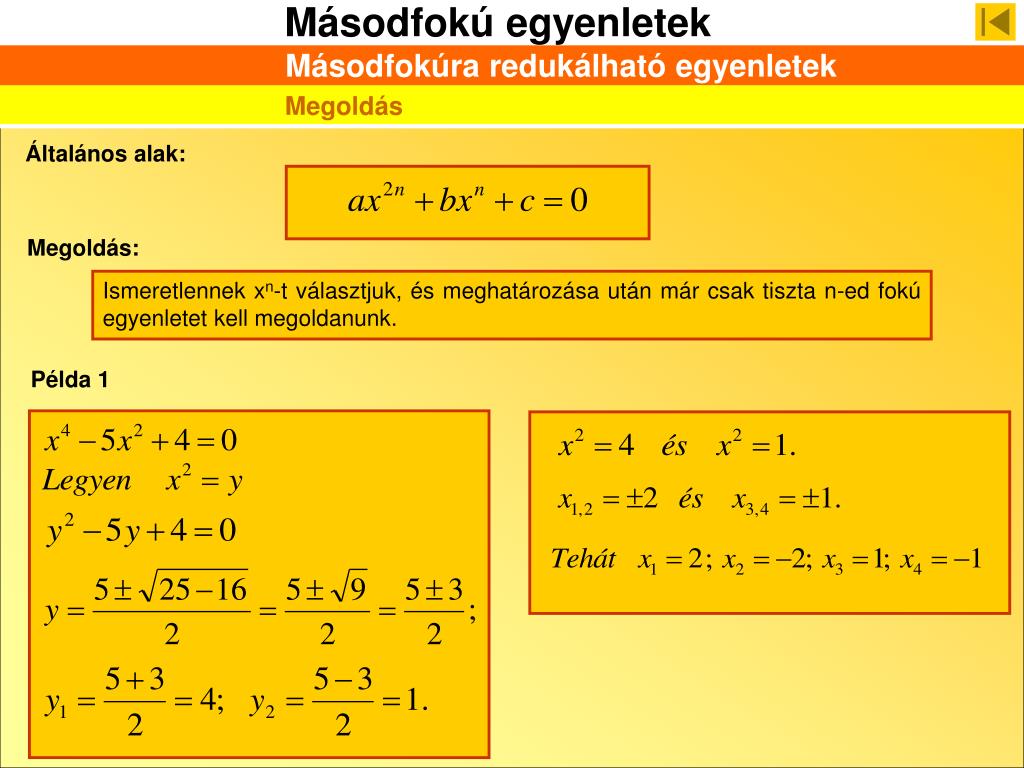 Példa 1 Másodfokúra redukálható egyenletek Megoldás Általános alak: Megoldás: Ismeretlennek xn-t választjuk, és meghatározása után már csak tiszta n-ed fokú egyenletet kell megoldanunk.