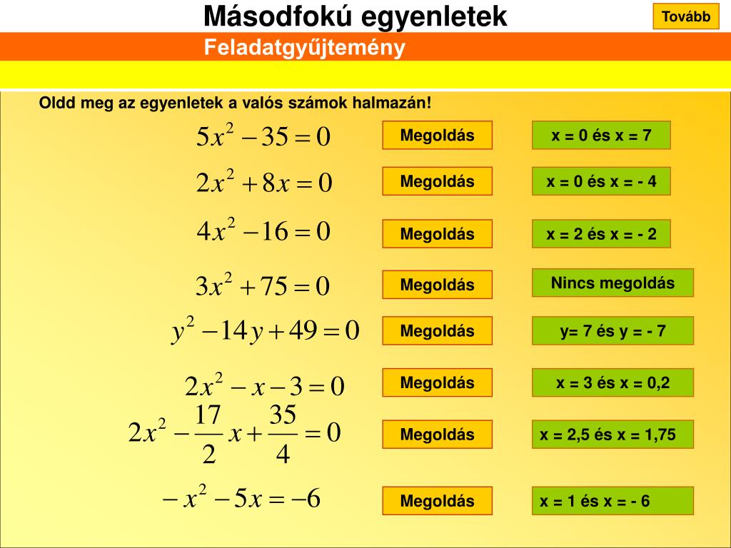 Tovább Feladatgyűjtemény Oldd meg az egyenletek a valós számok halmazán! Megoldás x = 0 és x = 7 Megoldás x = 0 és x = - 4 Megoldás x = 2 és x = - 2 Nincs megoldás Megoldás Megoldás y= 7 és y = - 7 Megoldás x = 3 és x = 0,2 Megoldás x = 2,5 és x = 1,75 Megoldás x = 1 és x = - 6