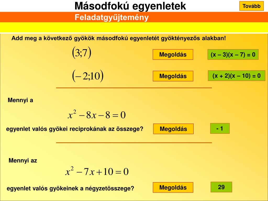 Tovább Feladatgyűjtemény Add meg a következő gyökök másodfokú egyenletét gyöktényezős alakban! Megoldás (x – 3)(x – 7) = 0 (x + 2)(x – 10) = 0 Megoldás Mennyi a - 1 egyenlet valós gyökei reciprokának az összege? Megoldás Mennyi az 29 Megoldás egyenlet valós gyökeinek a négyzetösszege?