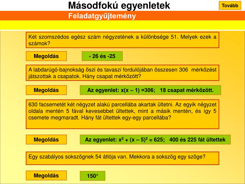 Tovább Feladatgyűjtemény Két szomszédos egész szám négyzetének a különbsége 51. Melyek ezek a számok? Megoldás - 26 és -25 A labdarúgó-bajnokság őszi és tavaszi fordulójában összesen 306 mérkőzést játszottak a csapatok. Hány csapat mérkőzött? Megoldás Az egyenlet: x(x – 1) =306; 18 csapat mérkőzött. 630 facsemetét két négyzet alakú parcellába akartak ültetni. Az egyik négyzet oldala mentén 5 fával kevesebbet ültettek, mint a másik mentén, és így 5 csemete megmaradt. Hány fát ültettek egy-egy parcellába? Megoldás Az egyenlet: x2 + (x – 5)2 = 625; 400 és 225 fát ültettek Egy szabályos sokszögnek 54 átlója van. Mekkora a sokszög egy szöge? Megoldás 150°