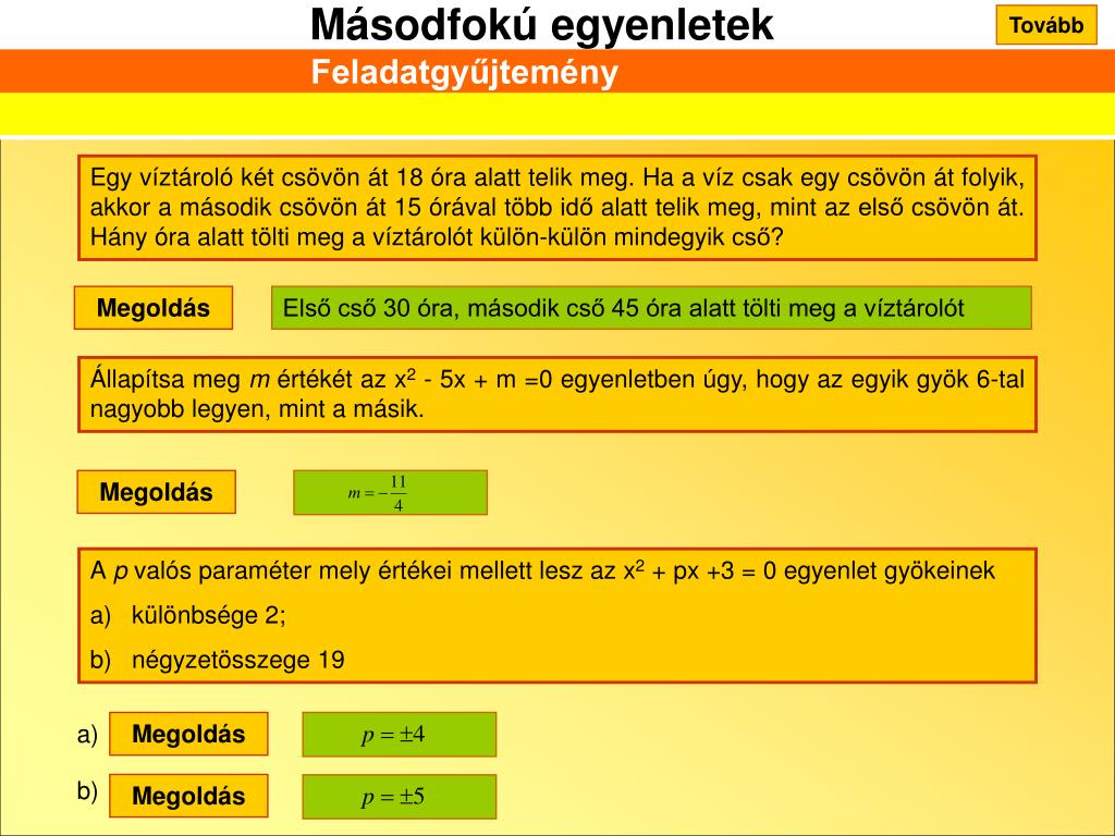 Tovább Feladatgyűjtemény Egy víztároló két csövön át 18 óra alatt telik meg. Ha a víz csak egy csövön át folyik, akkor a második csövön át 15 órával több idő alatt telik meg, mint az első csövön át. Hány óra alatt tölti meg a víztárolót külön-külön mindegyik cső? Megoldás Első cső 30 óra, második cső 45 óra alatt tölti meg a víztárolót Állapítsa meg m értékét az x2 - 5x + m =0 egyenletben úgy, hogy az egyik gyök 6-tal nagyobb legyen, mint a másik. Megoldás • A p valós paraméter mely értékei mellett lesz az x2 + px +3 = 0 egyenlet gyökeinek • különbsége 2; • négyzetösszege 19 a) Megoldás b) Megoldás