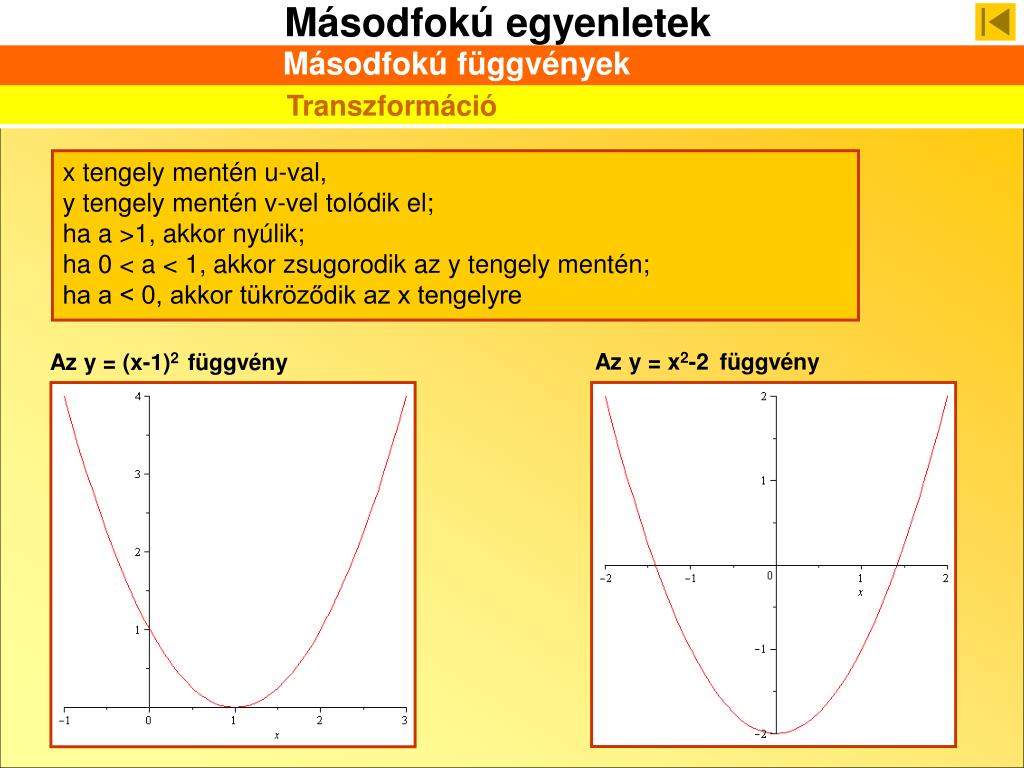 Másodfokú függvények Transzformáció x tengely mentén u-val, y tengely mentén v-vel tolódik el; ha a >1, akkor nyúlik; ha 0 < a < 1, akkor zsugorodik az y tengely mentén; ha a < 0, akkor tükröződik az x tengelyre Az y = x2-2 függvény Az y = (x-1)2 függvény