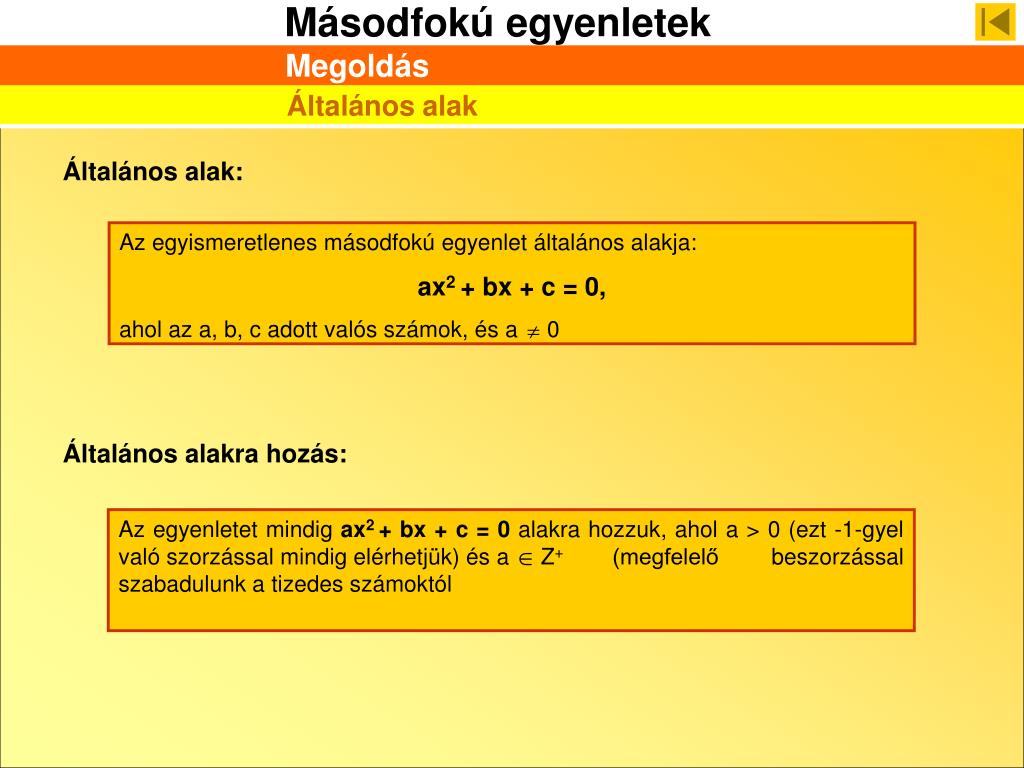 Az egyismeretlenes másodfokú egyenlet általános alakja: ax2 + bx + c = 0, ahol az a, b, c adott valós számok, és a 0 Az egyenletet mindig ax2 + bx + c = 0 alakra hozzuk, ahol a > 0 (ezt -1-gyel való szorzással mindig elérhetjük) és a Z+ (megfelelő beszorzással szabadulunk a tizedes számoktól Megoldás Általános alak Általános alak: Általános alakra hozás: