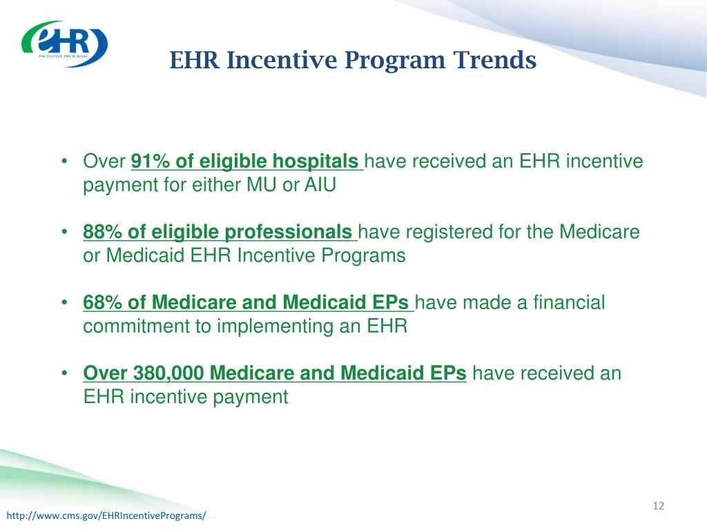 Incentive Program Trends EHR Incentive Program Trends • Over 91% of eligible hospitals have received an EHR incentive payment for either MU or AIU • 88% of eligible professionals have registered for the Medicare or Medicaid EHR Incentive Programs • 68% of Medicare and Medicaid EPs have made a financial commitment to implementing an EHR • Over 380,000 Medicare and Medicaid EPs have received an EHR incentive payment