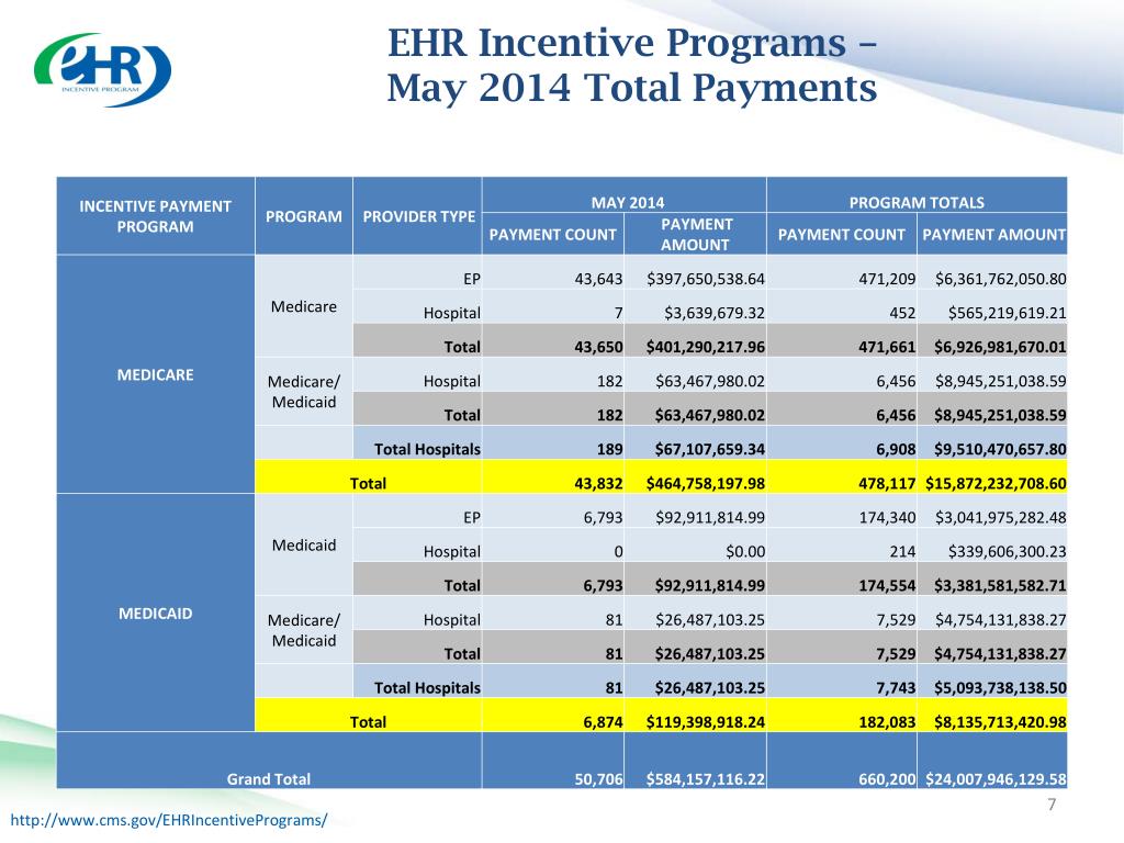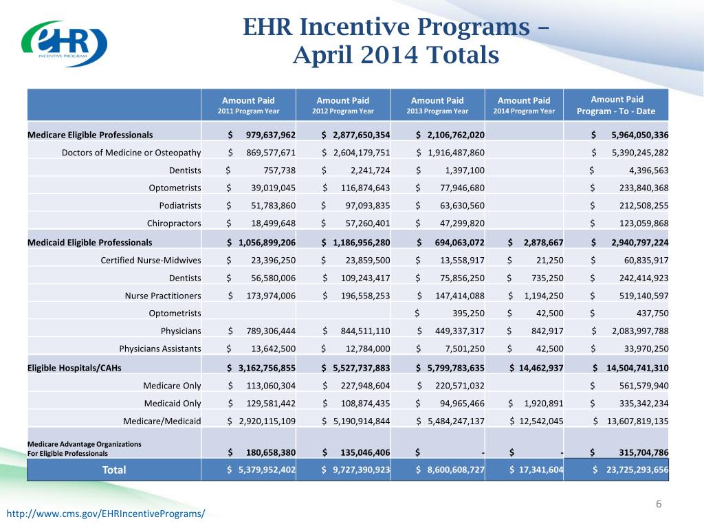 EHR Incentive Programs – May 2014 Total Payments Incentive Programs